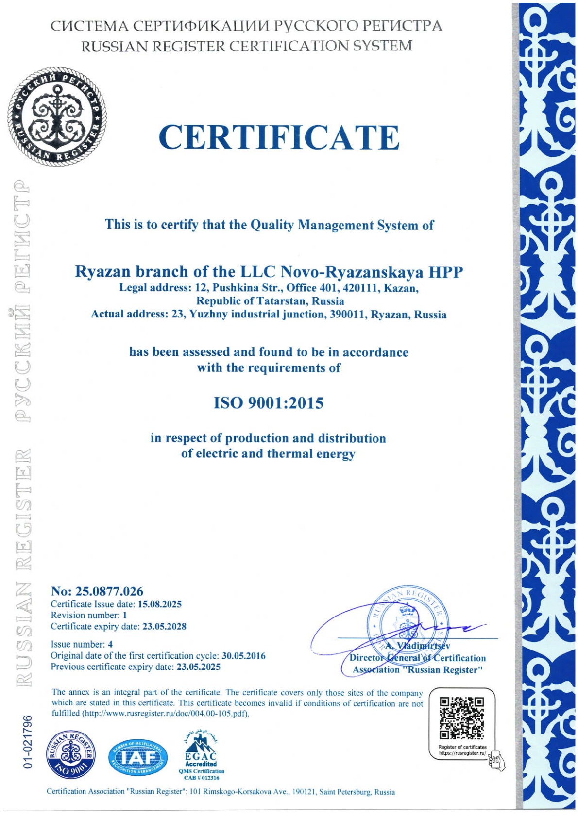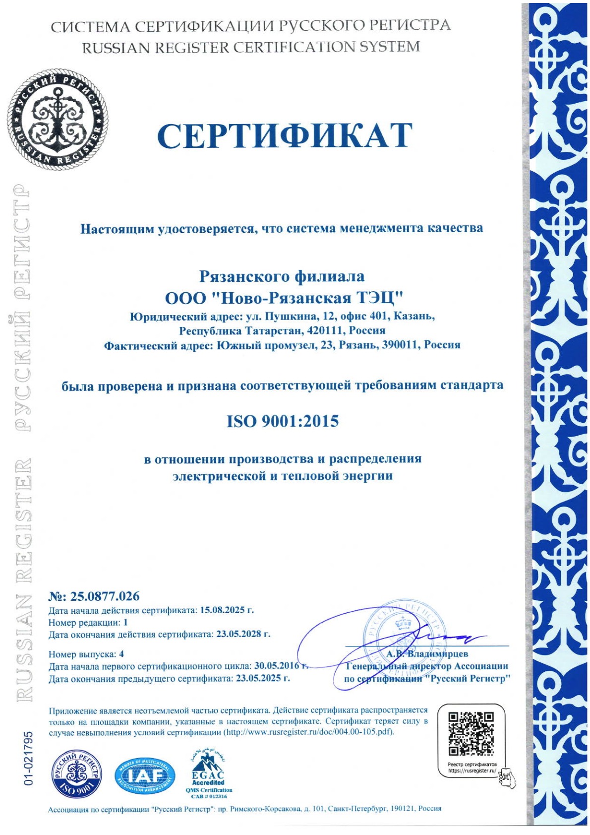 Сертификаты соответствия системы менеджмента качества Ново-Рязанской ТЭЦ международному стандарту ISO 9001:2015